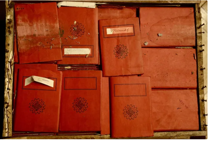 Entre los papeles había postales, fotos y material propagandístico del régimen nazi. Y miles de libretas: algunas de la Organización del Partido Nacional Socialista en el exterior y otras de la Unión Alemana de Gremios.