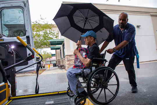 El martes, Andre Quinones ayuda a Mike Greene a subir a un vehículo de transporte después de su cita de diálisis en el St. Petersburg Kidney Center South en St. Petersburg, Florida, mientras se acercaba el huracán Milton. Greene, a instancias de Quinones, estaba haciendo planes para evacuar Orlando más tarde esa noche. (Ted Richardson). Informe de Cynthia Zak, corresponsal de Cadena 3 en Estados Unidos.