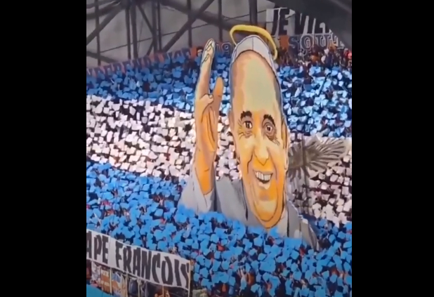 Con un mosaico enorme, la aficción francesa del Olympique de Marsella cubrió completamente una de las tribunas del Stade Vélodrome con la bandera argentina en honor al Sumo Pontífice, recientemente fallecido.