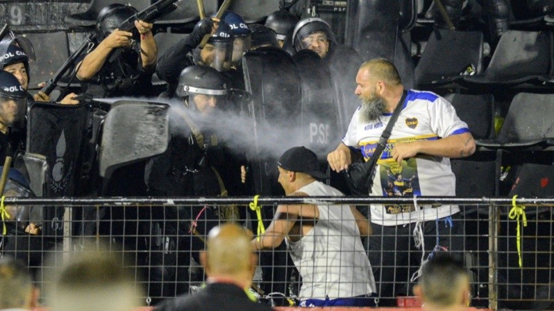 Esa situación puso en riesgo la continuidad del partido donde se definía el pase a las semifinales de la Copa Argentina. En el medio del enfrentamiento con la policía emergió Juan Román Riquelme, quien evitó que los violentos se siempre lograran su objetivo de avanzar hacia la tribuna del Palomar ocupada por la parcialidad platense.