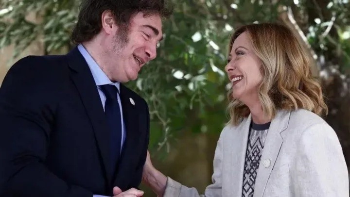 En el inicio de su agenda oficial como invitado a la cumbre de líderes del G7, el presidente Javier Milei fue recibido este viernes por la primera ministra italiana, Giorgia Meloni, con quien intercambó unas palabras en el exclusivo complejo hotelero Borgo Egnazia.