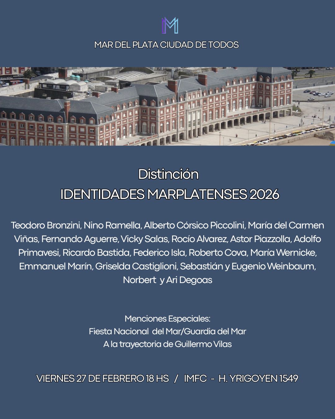 En el marco de las actividades del 152 Aniversario de la Ciudad, la Mesa de Trabajo Mar del Plata Ciudad de Todos anuncia la entrega de las distinciones “Identidades Marplatenses” el viernes 27 de febrero a las 18 hs en el Instituto Movilizador de Fondos Cooperativos, Hipólito Yrigoyen 1549.