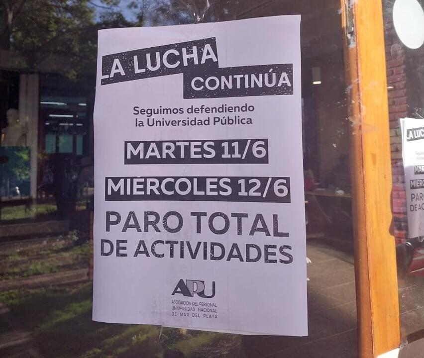 Tras una reunión de Mesa Ejecutiva y Cuerpo de Delegados y Delegadas, Adum (Agremiación Docente Universitaria Marplatense) decidió adherir al paro nacional universitario de este martes 11 y miércoles 12 de junio.
