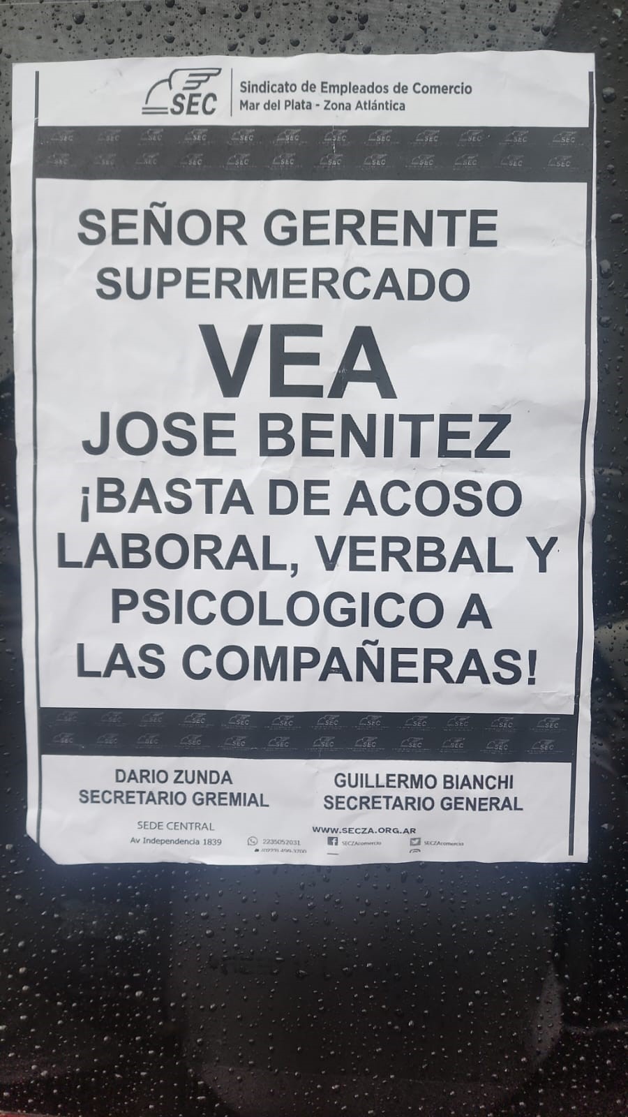 En el día de hoy se lleva a cabo una marcha en repudio al acoso laboral, psicológico y verbal ejercido por el gerente José Benítez, en la sucursal de Supermercados Vea en San Clemente del Tuyú.