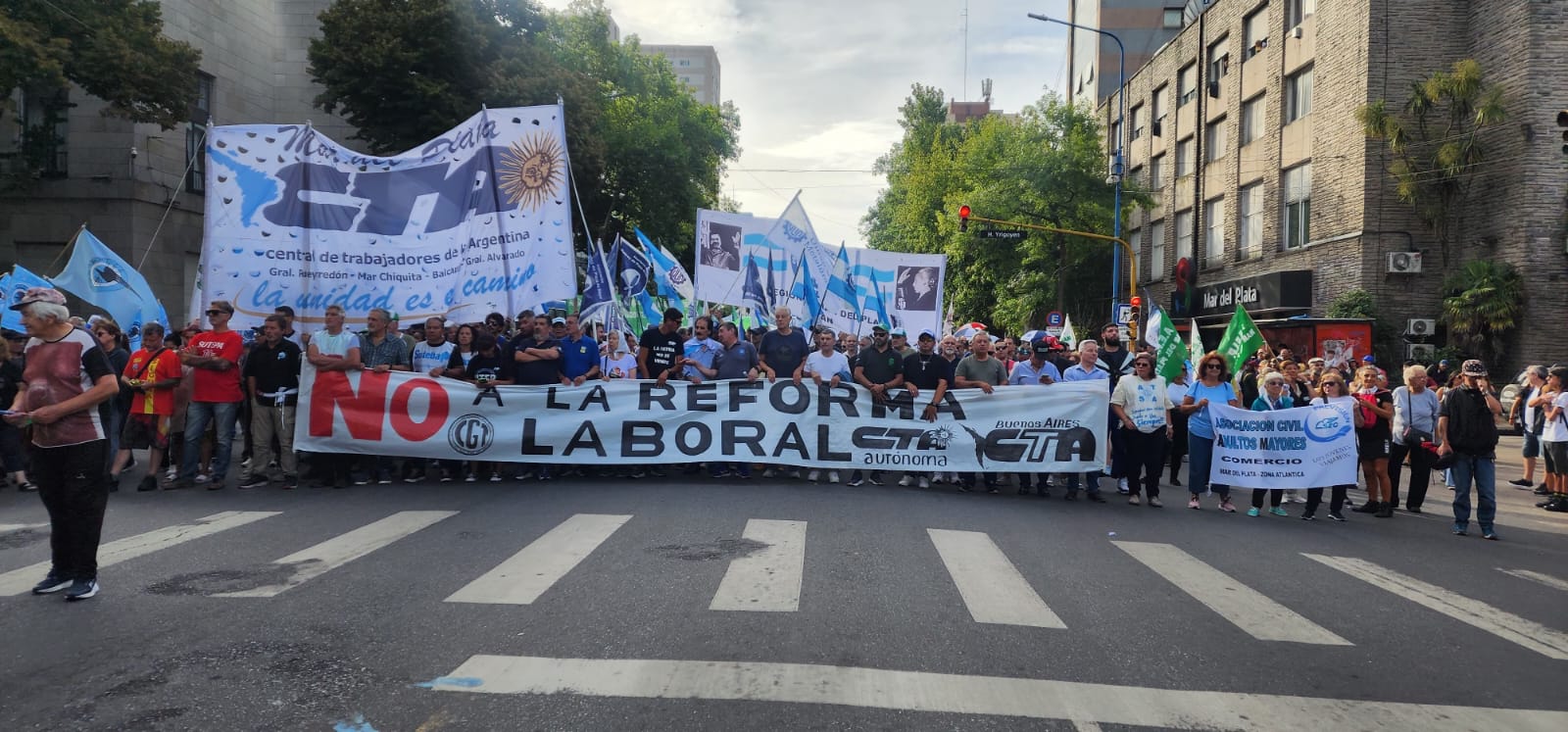 Una masiva movilización se llevó a cabo esta tarde en el centro de Mar del Plata, donde las centrales obreras, sindicatos, jubilados y organizaciones sociales se pronunciaron en contra del proyecto de reforma laboral que se debate en el Congreso nacional. El secretario general de la Confederación General de Trabajo (CGT), José Luis Rocha, llamó a convocar un paro general.