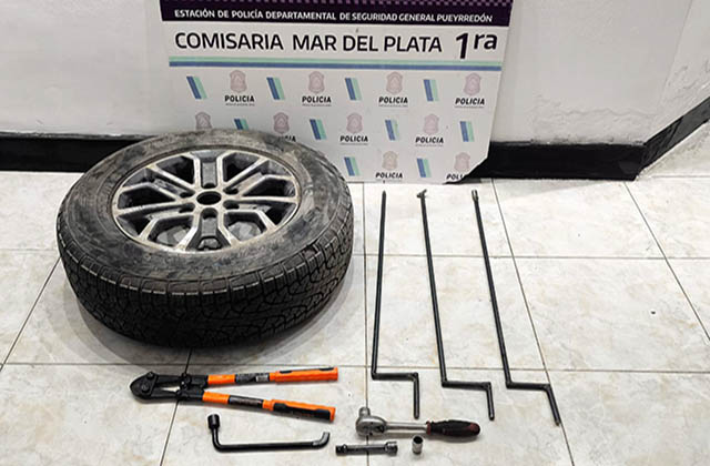 Durante la requisa, los efectivos secuestraron una rueda completa rodado 18 marca Pirelli Scorpions, además de herramientas utilizadas para el ilícito: una tijera corta pernos, un mango de fuerza con dado de 17 mm, tres extensores para criquet de auxilio y una llave para tornillos de rueda.