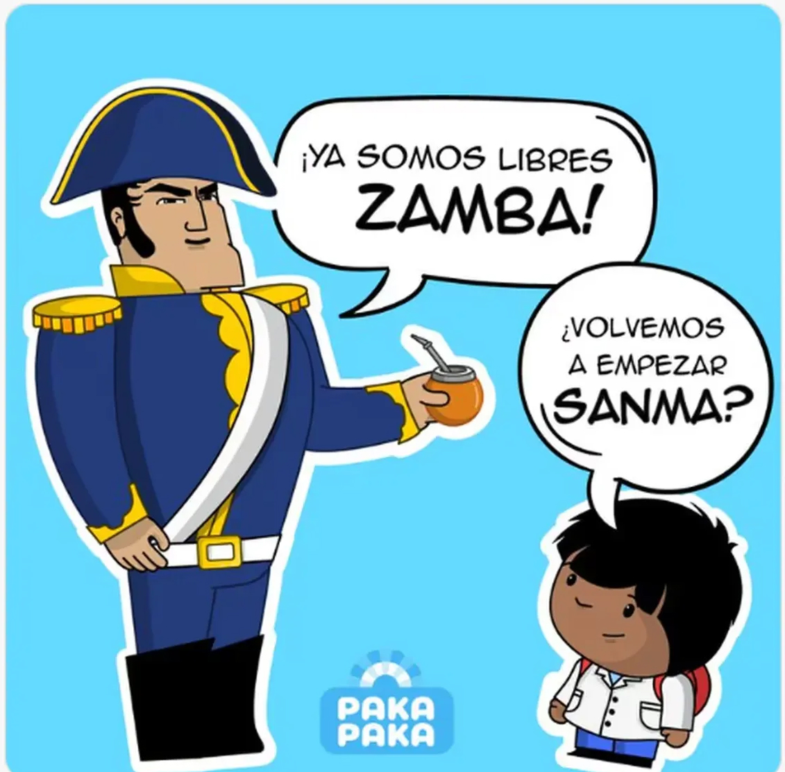 En una nueva cuenta de X de la señal de televisión, se publicó una imagen en la que se aprecia una caricatura de San Martín y de Zamba, principal personaje animado de esta marca, en la que el prócer le dice al niño “Ya somos libres”, mientras que este le pregunta si vuelven “a empezar”.